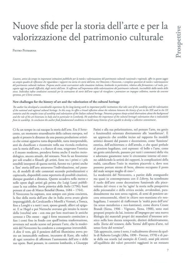 The author has developed a considerable experience by his long-lasting work in important public institutions that take care of the wardship and the valorization of the national and regional cultural heritage. In this essay, he off ers a broad refl ection about the relations between the history of art in the XIX and in the XX centuries and the complex issues of wardship and valorization of the Italian cultural heritage. Petraroia proposes sharp-witted observations about the background and the role of the art historians in Italy and in particular in Lombardy. He underlines the importance of the cultural heritage’s valorization that is indissoluble from its wardship. In conclusion the author fi nds fundamental conditions to build many histories of art capable to develop a collective commitment.