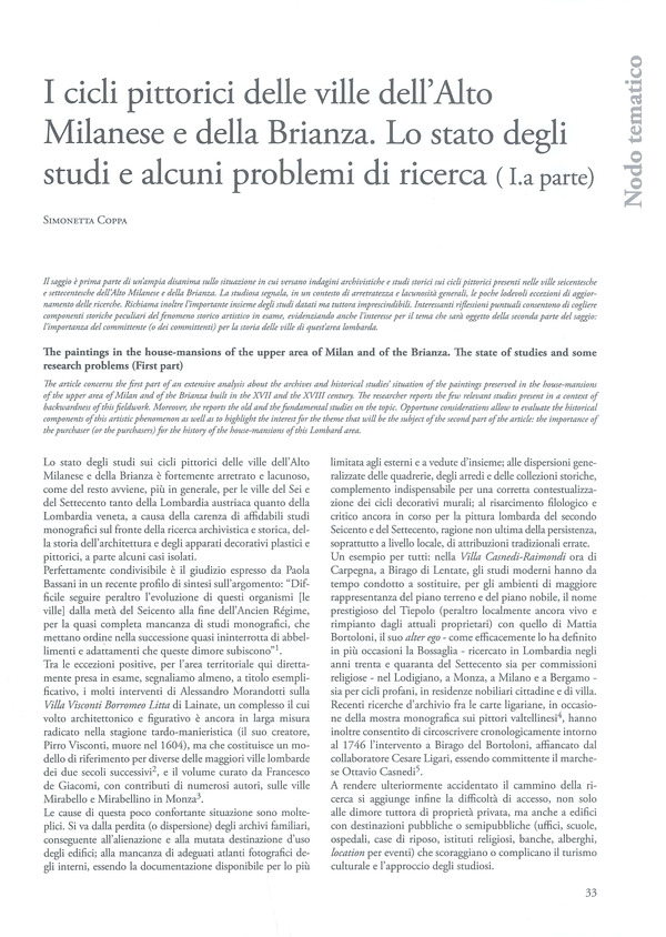 Il saggio e prima parte di un’ampia disanima sullo situazione in cui versano indagini archivistiche e studi storici sui cicli pittorici presenti nelle ville seicentesche e settecentesche dell’Alto Milanese e della Brianza. La studiosa segnala, in un contesto di arretratezza e lacunosità generali, le poche lodevoli eccezioni di aggiornamento delle ricerche. Richiama inoltre l’importante insieme degli studi datati ma tuttora imprescindibili. Interessanti riflessioni puntuali consentono di cogliere componenti storiche peculiari del fenomeno storico artistico in esame, evidenziando anche l’interesse per il tema che sarà oggetto della seconda parte del saggio: l’importanza del committente (o dei committenti) per la storia delle ville di quest’area lombarda.