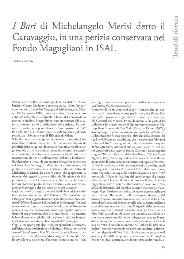 I Bari di Michelangelo Merisi detto il Caravaggio, in una perizia conservata nel Fondo Magugliani in ISAL