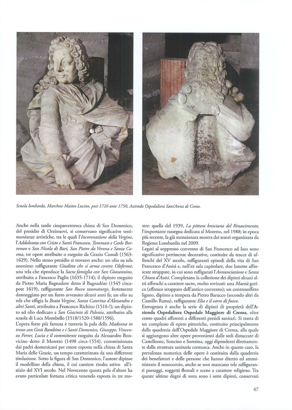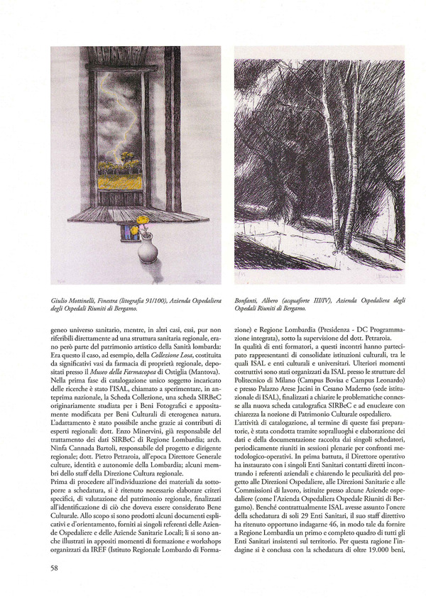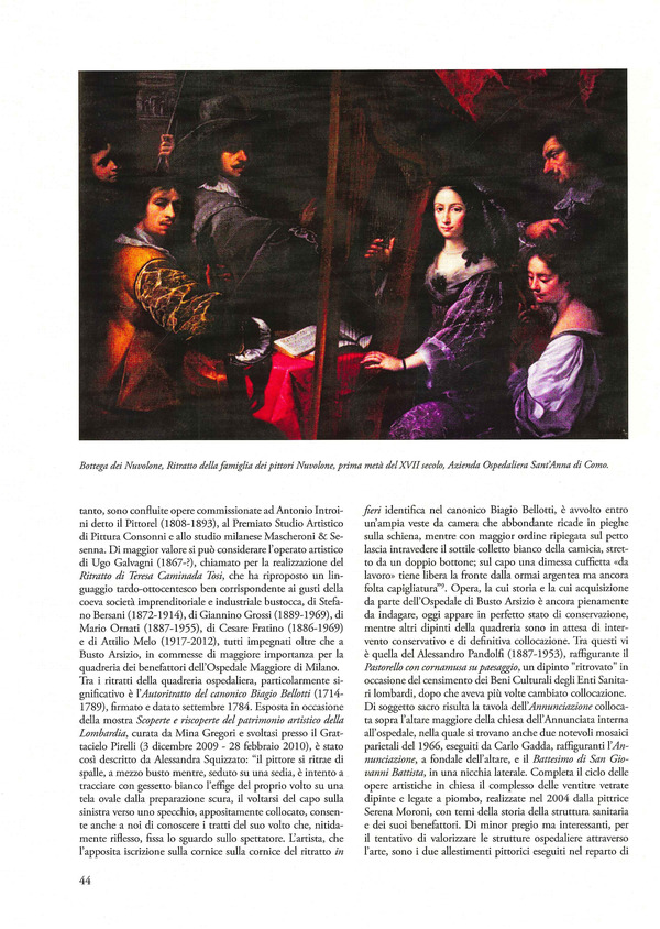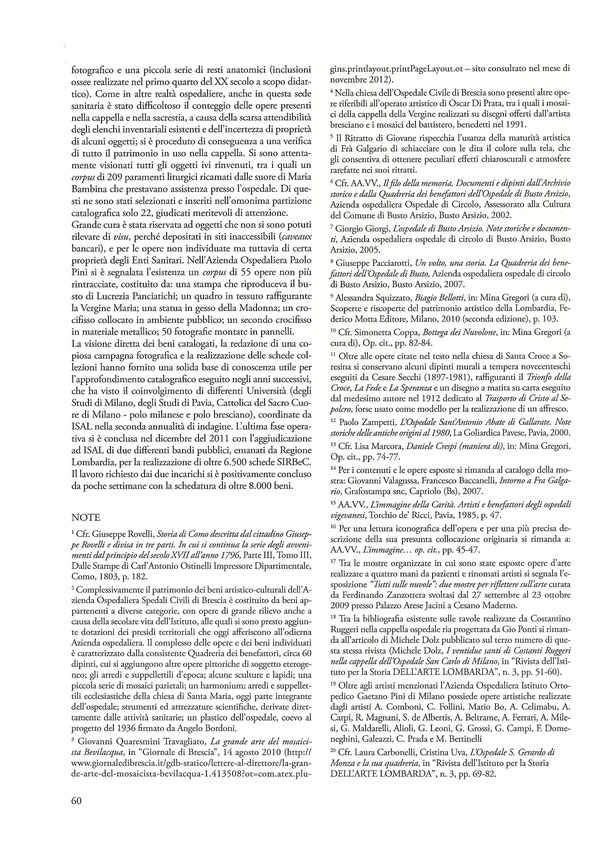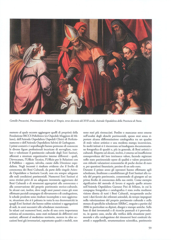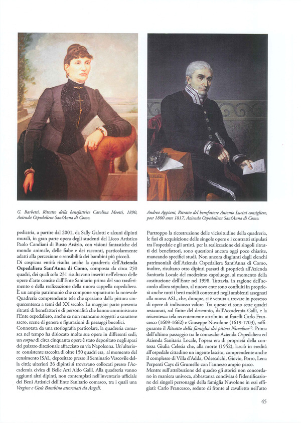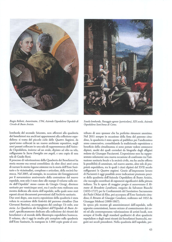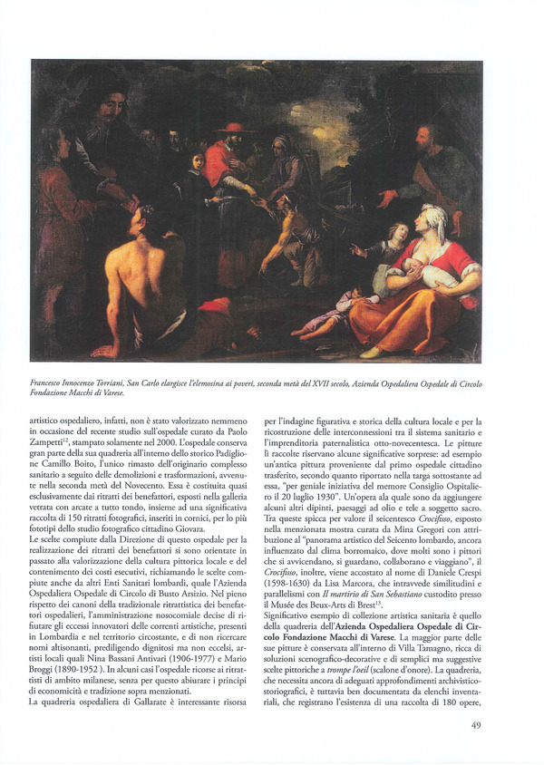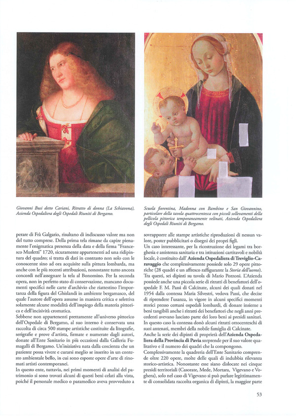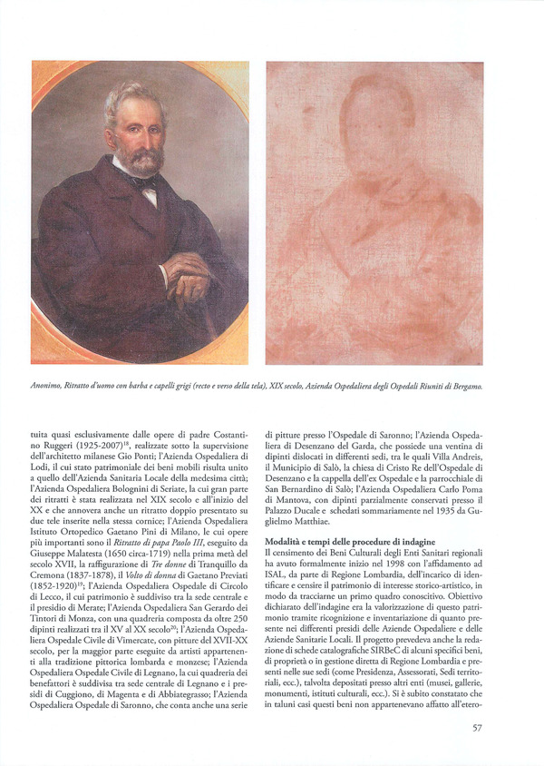 Il saggio propone un primo quadro conoscitivo unitario delle differenti quadrerie degli Enti Sanitari lombardi, proprietari di un vastissimo patrimonio artistico acquisito attraverso una reiterata serie di donazioni susseguitesi nei secoli e molteplici committenze a carattere ritrattistico e religioso. L’autore inquadra il tema nell’ambito più ampio del concetto di “Bene Culturale”, secondo quanto sancito dal Codice dei Beni Culturali e del Paesaggio, presentando anche alcune aspetti metodologici della campagna di catalogazione del patrimonio artistico-culturale afferente alla Sanità lombarda commissionata da Regione Lombardia ad alcune istituzioni culturali (Università degli Studi di Milano, Università degli Studi di Pavia, Università Cattolica del Sacro Cuore di Milano -polo milanese e polo bresciano), spesso coordinate da ISAL. Dopo aver ripercorso alcune tappe salienti di questo processo conoscitivo il saggio presenta le principali collezioni pittoriche, evidenziando per ciascuna peculiarità ed emergenze qualitative.