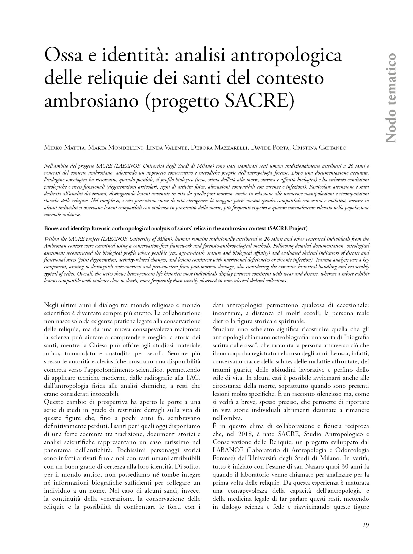 Ossa e identità: analisi antropologica delle reliquie dei santi del contesto ambrosiano (progetto SACRE)
